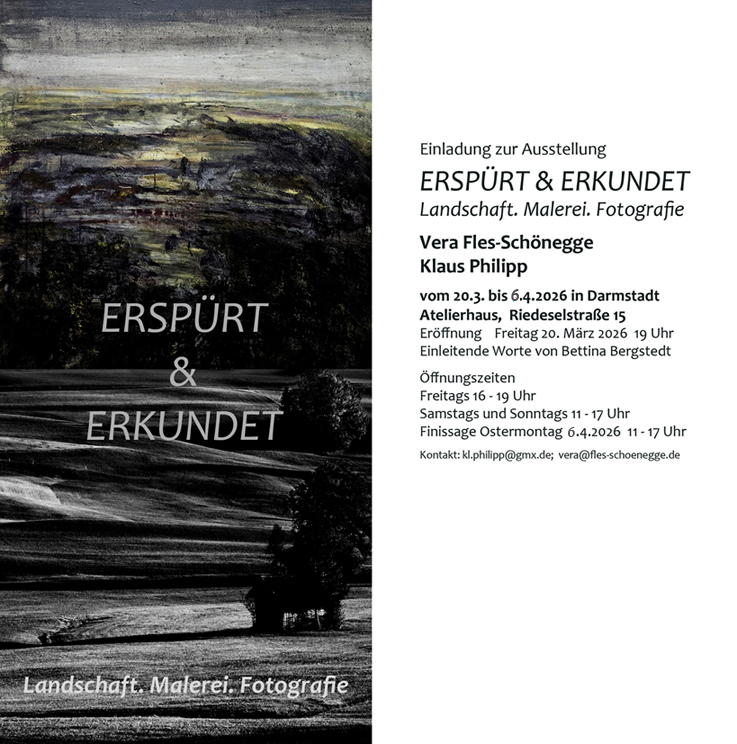 Die Ausstellung im Atelierhaus Darmstadt stellt zwei künstlerische Positionen zur Landschaftdarstellung einander gegenüber: die Malerei von Vera Fles-Schönegge und die Fotografie von Klaus Philipp.